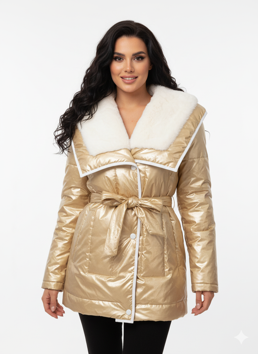 Luxe Wet Look Puffer Jacket | Faux Fur Collar & Belted